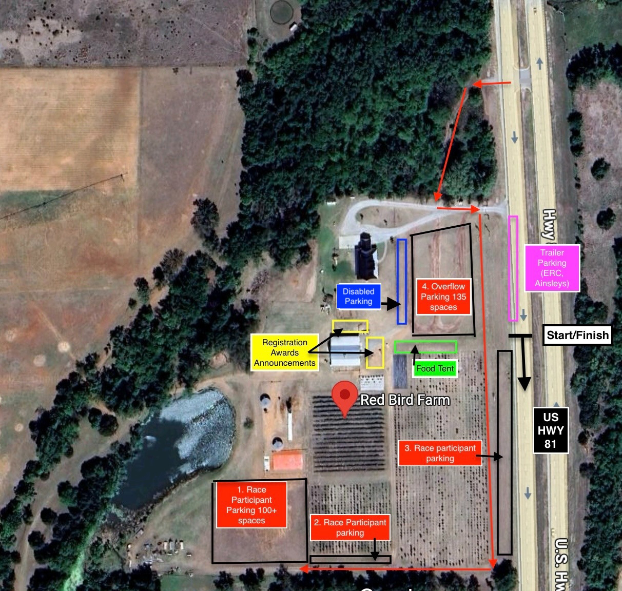 The Great Land Run is a mildly rolling, out and back 5K, 10K and Half Marathon course. The race start/finish will be in front of Red Bird Farm on US 81.